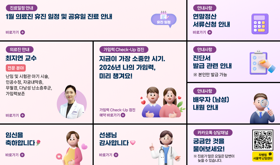 반복착상실패, 습관성유산, 난소기능저하, 착상전 유전진단(PGT-A, PGT-SR, PGT-M), 자궁내막증, 자궁경, 난자냉동, 외국인 진료