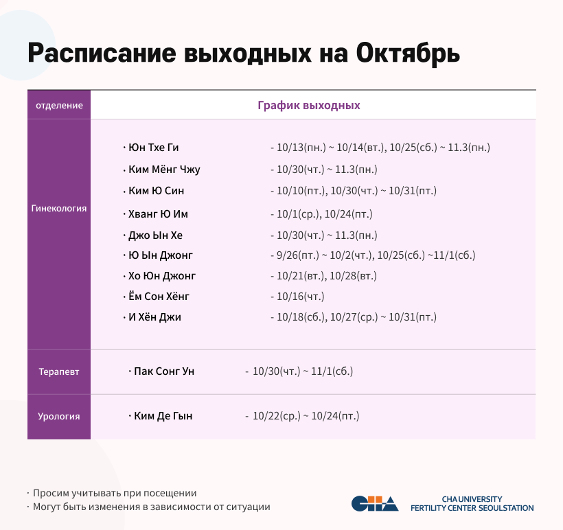 Расписание выходных на Октябрь